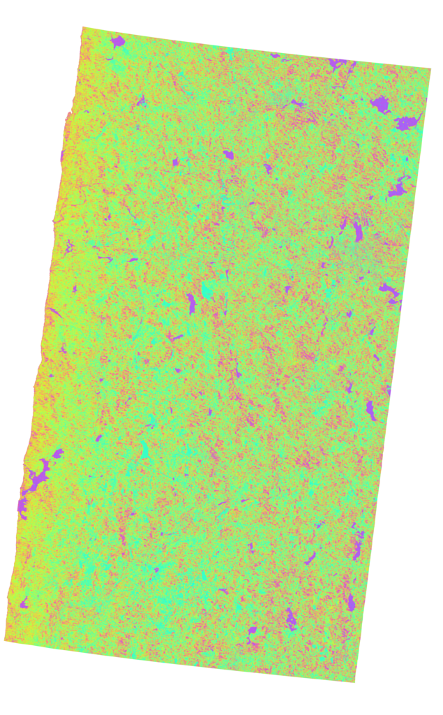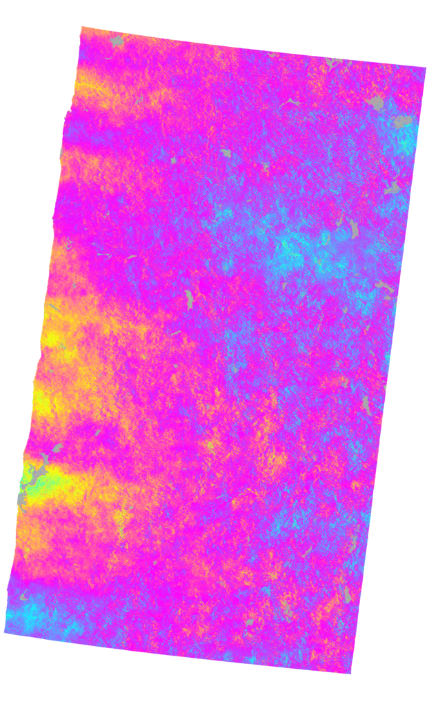Decorrelation in the image can be caused by bodies of water in the image, long time-span between acquisitions, or rapid change in the scene. Decorrelation often causes problem resolving the phase in the interferogram.
