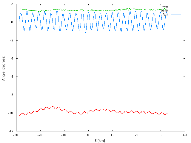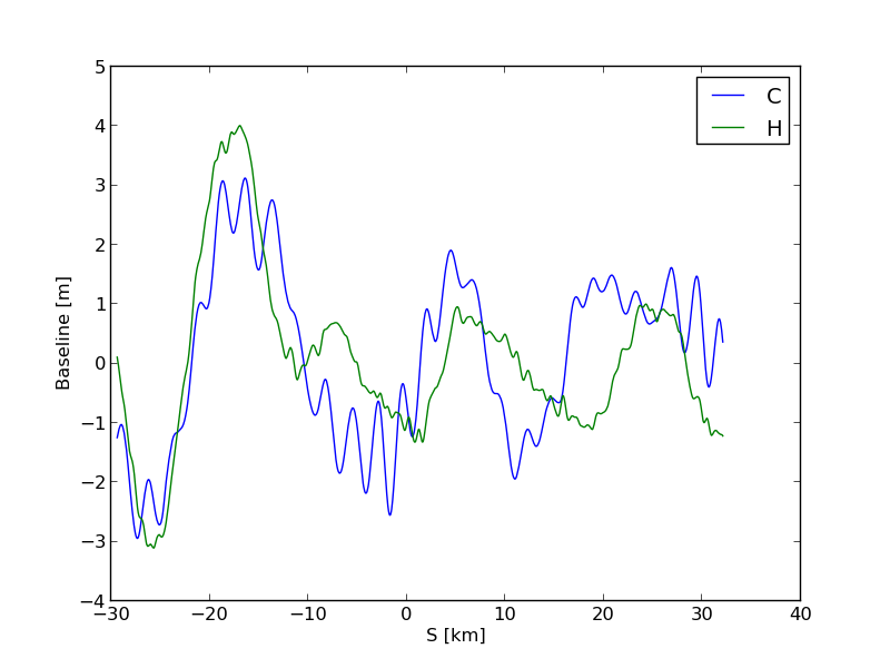 vertical (H) directions as a function of the along-track coordinate (S).